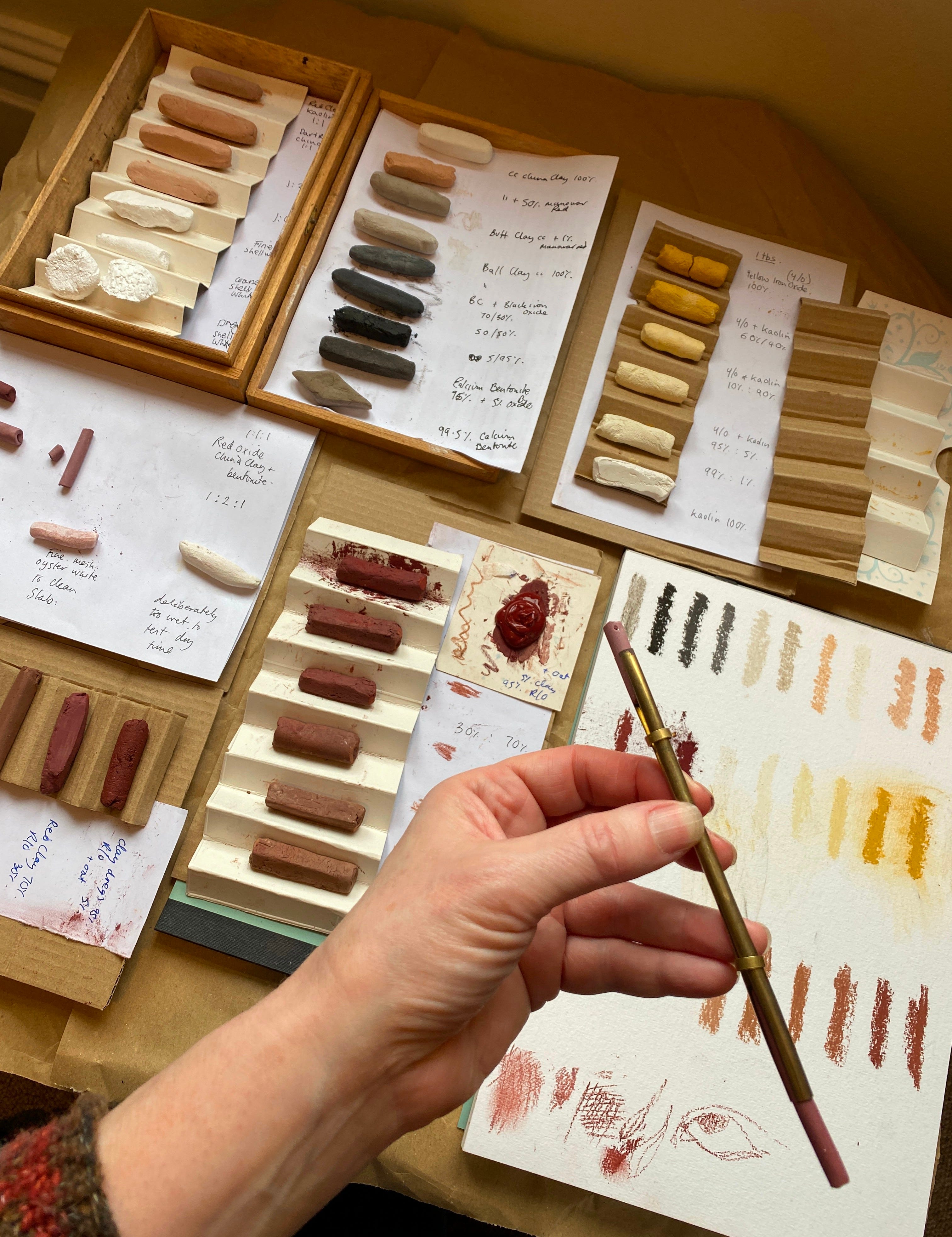 We will be focussing on gauging then refining the quality of our pigments, whether bought, foraged, gifted, or swapped, learning how to source and assess our raw materials to make the finest quality art tools. We will make pastels of several kinds and the two paints we will specialise in will be watercolours in half pans and gouache, which can also be stored wet, in jars or tubes. We will focus on natural pigments during the week, but all the methods will be applicable to any safe synthetic pigment you may later wish to explore.